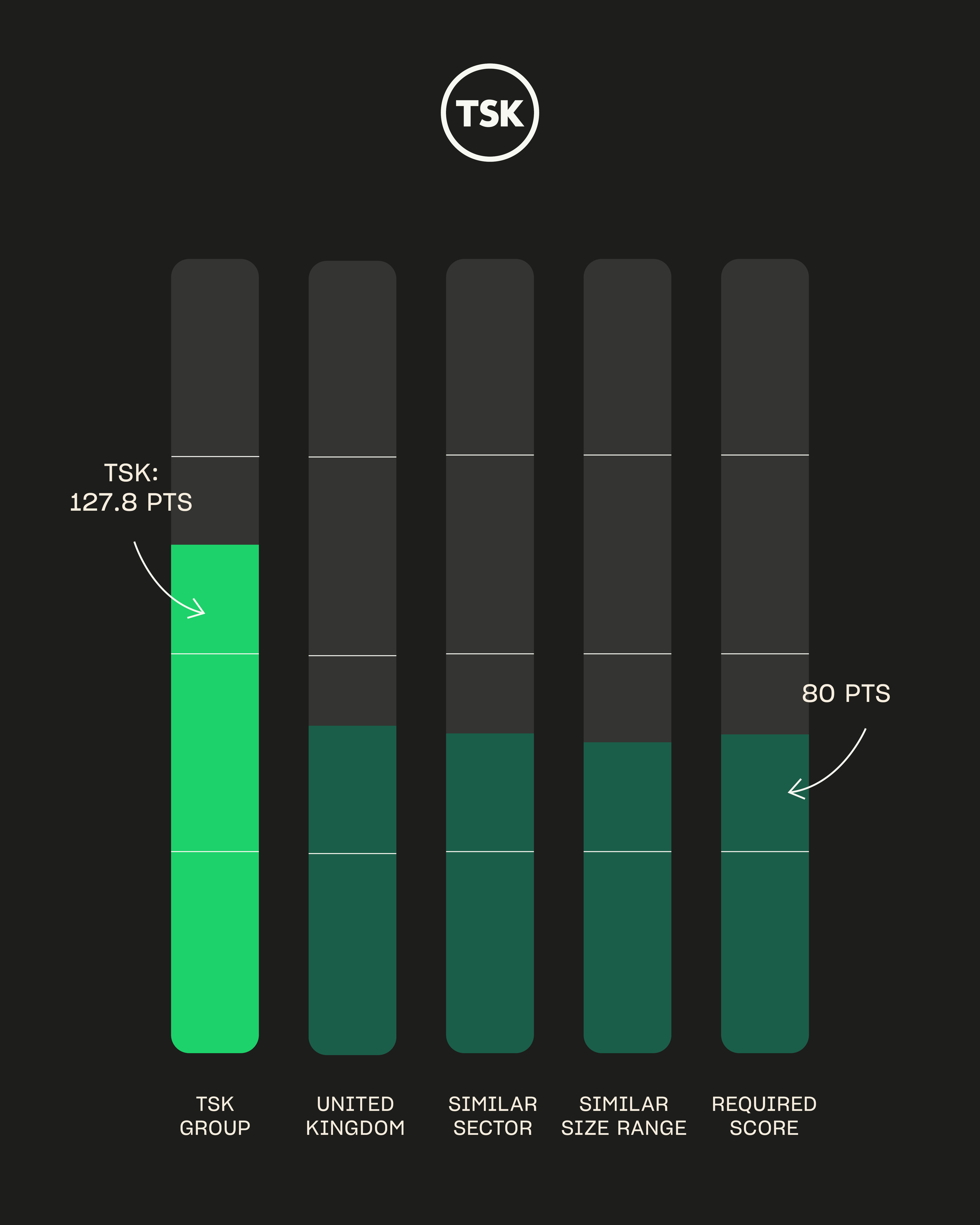 The B Corp assessment evaluates impact across five categories: governance, workers, community, environment and customers. TSK’s verified score was 127.8, compared with a pass threshold of 80. The results reflect how our policies, practices and outcomes align with these areas. Certification provides a structured, independent view of how our business contributes across each dimension, offering clients, partners and employees a clear reference point for trust, accountability and long-term value.